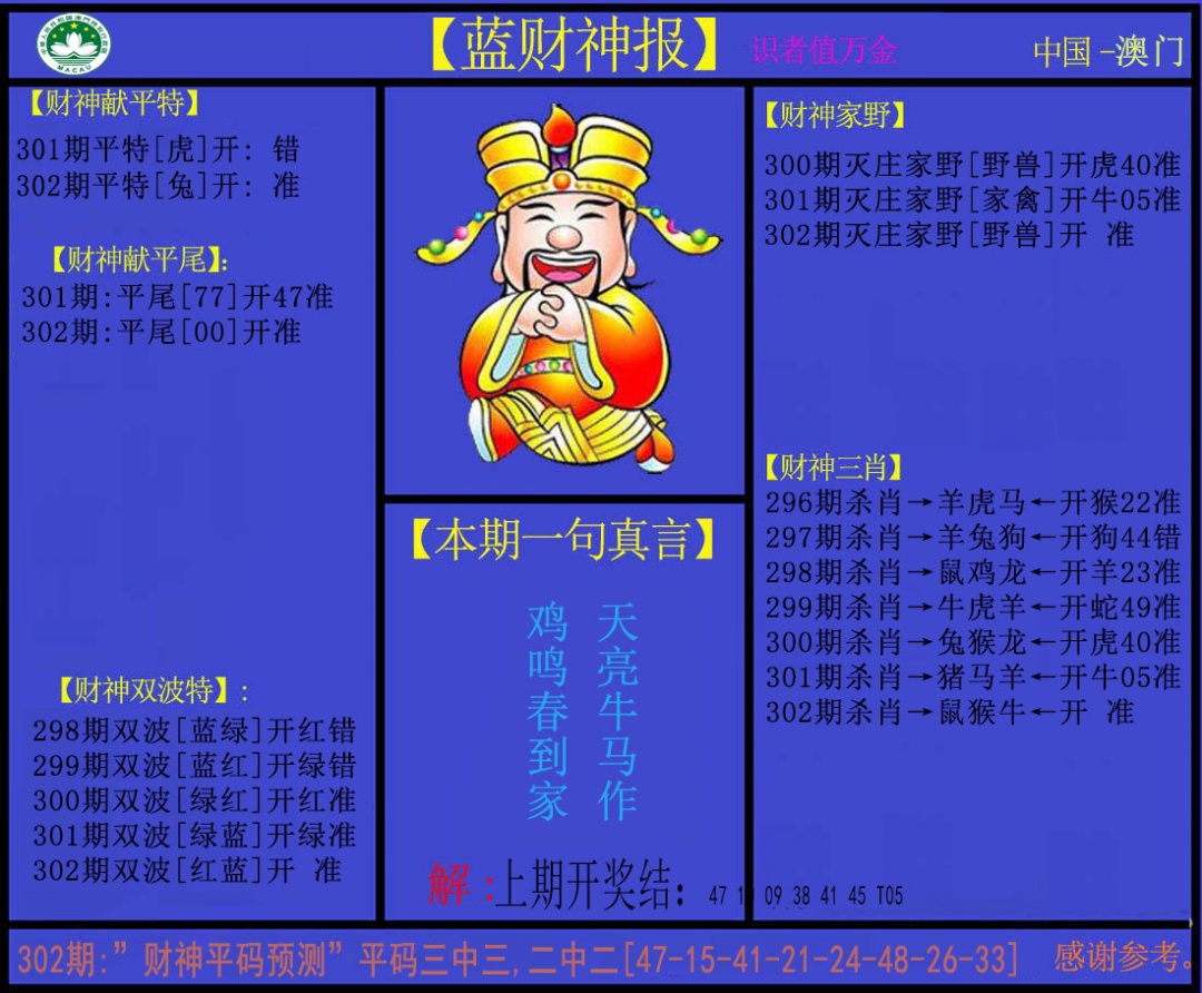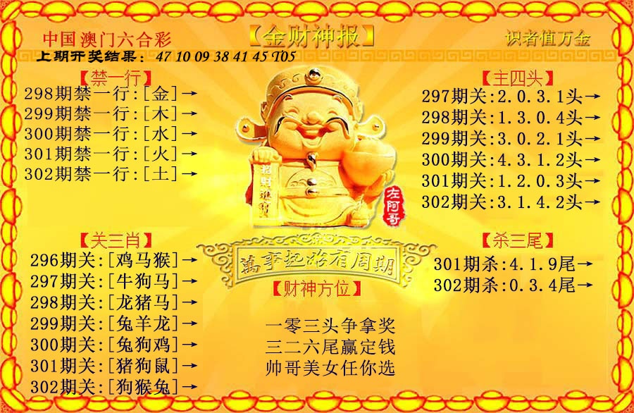 | 302期 | 〖龙狗牛虎蛇猴〗实现梦想的强料 | 开:?00准 |