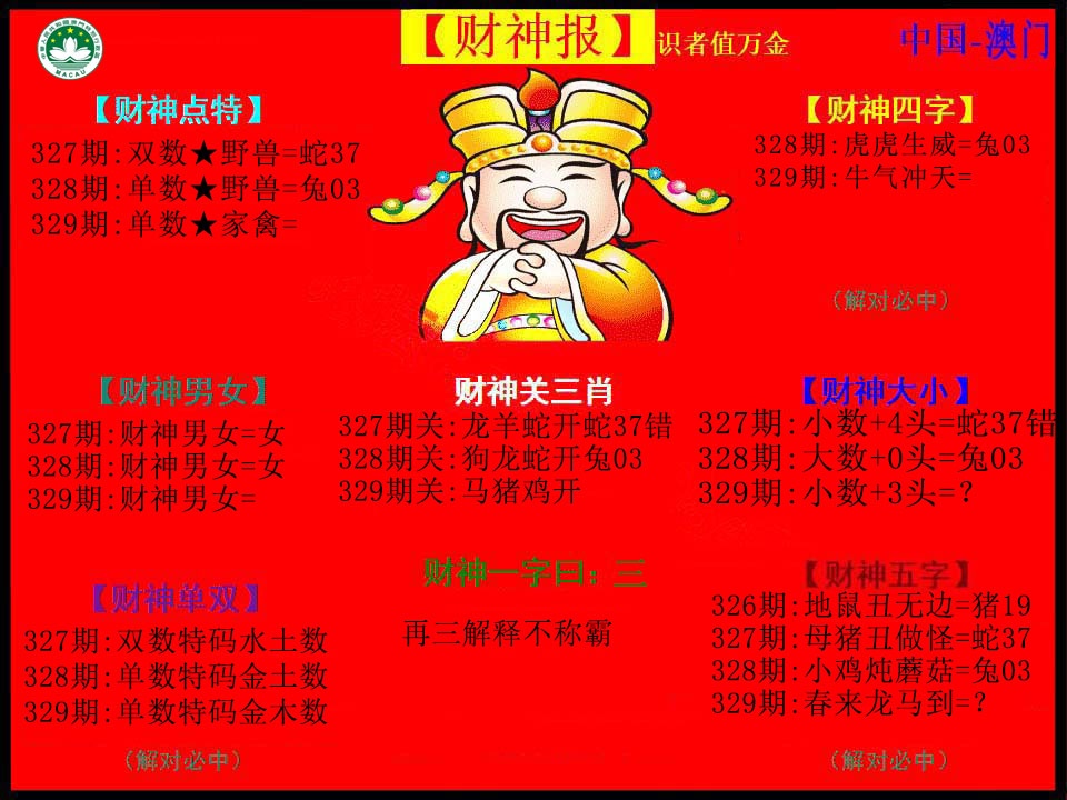 | 327期 | 〖狗鼠猪兔蛇猴〗实现梦想的强料 | 开:蛇37准 |